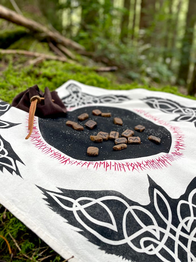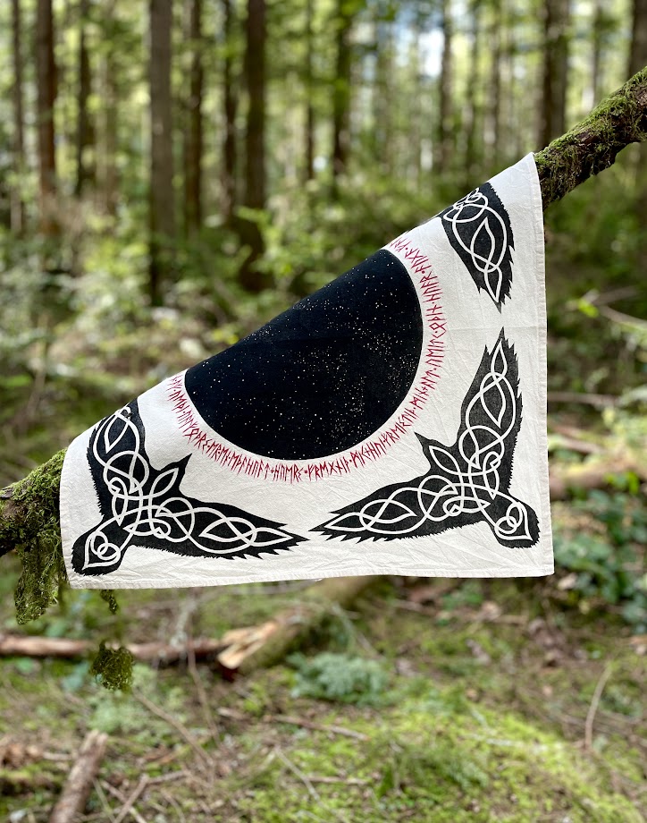 Hand-carved and hand-printed on 100% cotton this Runic Altar/Casting cloth waits for you. Whether you use Runes, Tarot cards, or you just want to add a little of the old magic to your space, this Altar Cloth is ready to aid you in your journey.